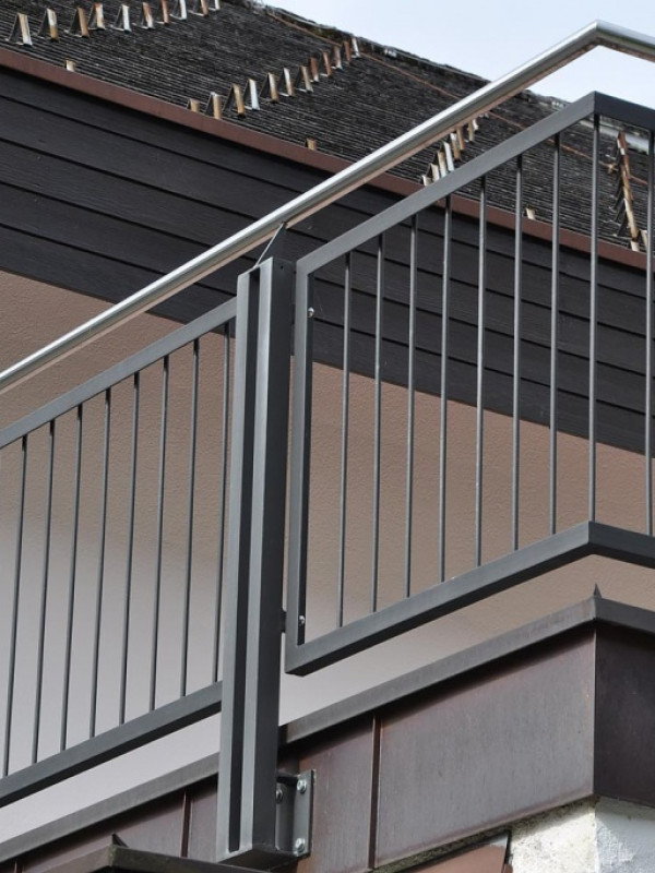 Лофт 2 эффектно подчеркнёт балкон, террасу, визуально сделает акцент на подиум. Внешне конструкция выглядит легко, просто и лаконично: прямоугольные блоки по четырем внешним сторонам состоят из металлических полосок, внутри блоков ровные ряды тонких прутьев из нержавеющей стали. Блоки соединены между собой вертикальными связующими креплениями правильной прямоугольной формы. На представленной модели виден вариант фиксации ограждения для балкона. Крепеж с конструкцией выглядит целостно и гармонично. По всей длине ограждения протянуты перилла классической округлой формы. Если конструкцию планируется устанавливать на улице – то дополнительно наши мастера обработают поверхность цинкосодержащей грунтовкой для защиты материала от коррозии и перепадов температуры. Все крепежные элементы гладкие на ощупь, эргономичной формы для максимальной безопасности в процессе эксплуатации.