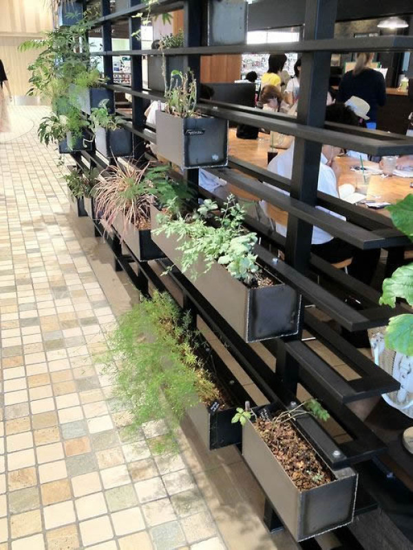 - Четвертая: перегородка состоит из полок одного размера, расположенных на одинаковой высоте, к полкам прикреплены деревянные ящики под цветы.